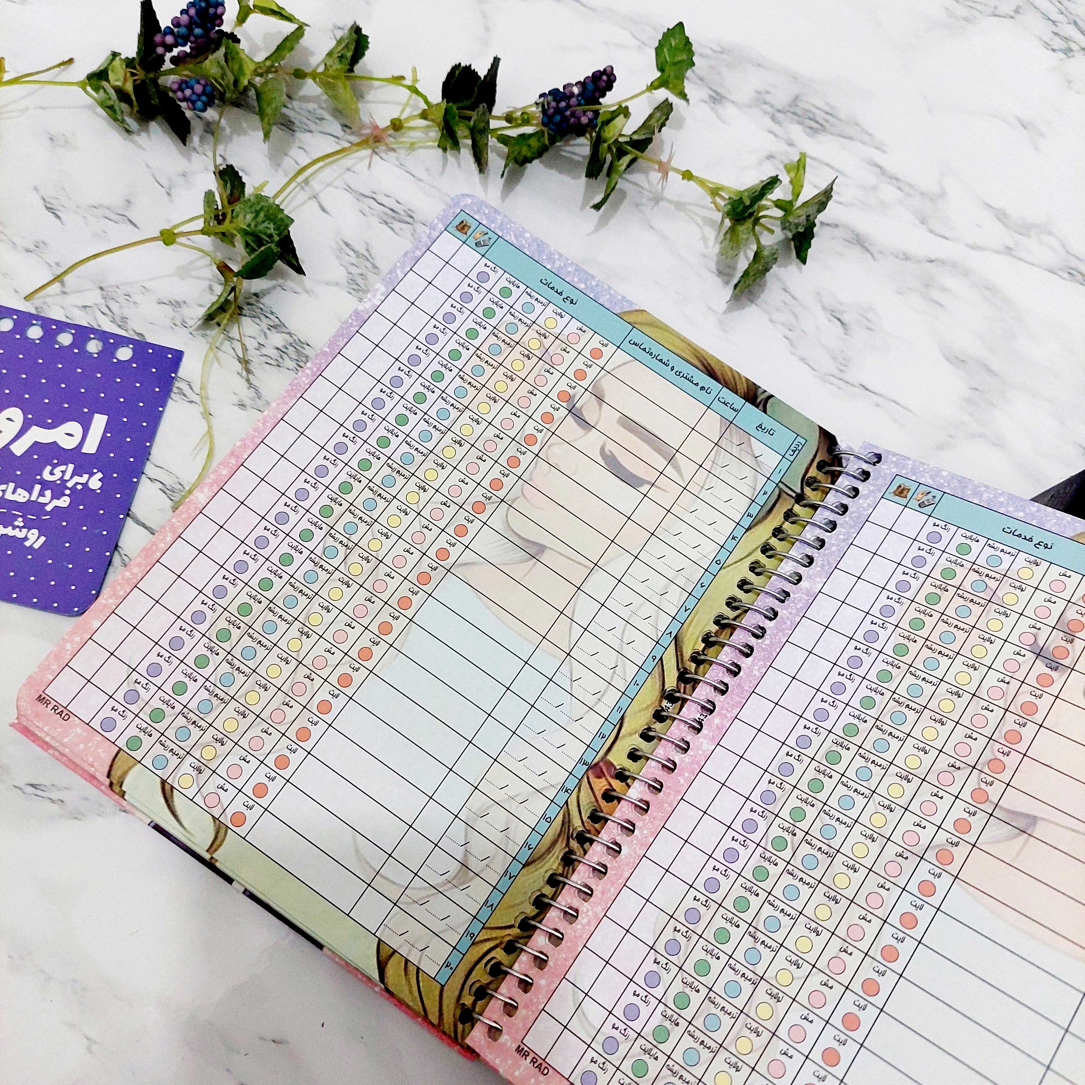 رنگ موکاری یدونه دفتر نوبت دهی برات از واجباته 75 صفحه رنگی و جدول کشی شده برای فیکس کردن نوبت مشتری ها جلد سختش باعث میشه دفتر دیر تر خراب بشه