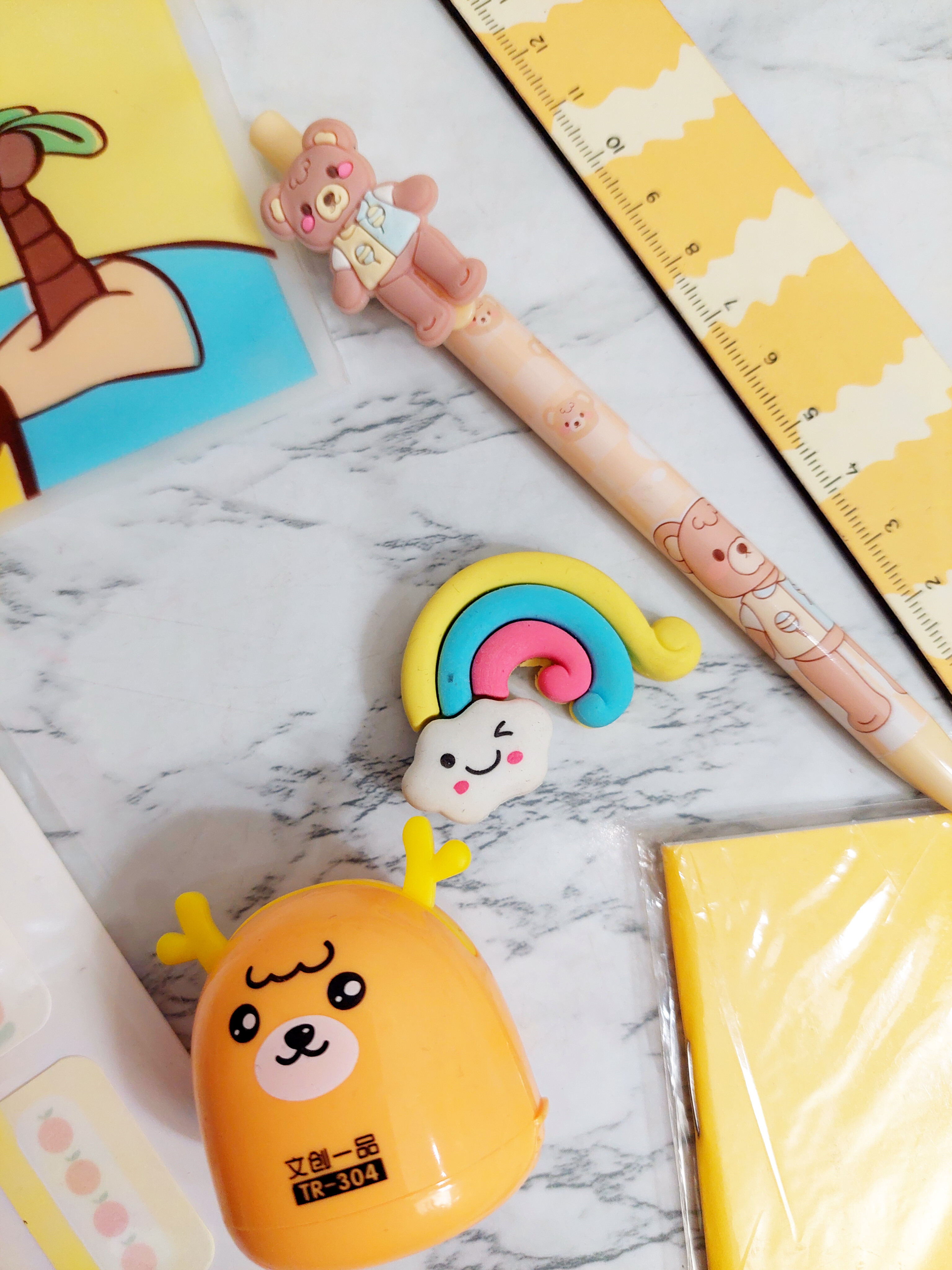 این پک شامل یک عدد پوشه سایز آپنج،یک عدد برچسب اسم،یک عدد چسب زخم یک عدد دفترچه،یک عدد تراش طرح گوزن،یک عدد پاکن طرح رنگین کمان، یک عدد اتود پنج دهم طرح خرس