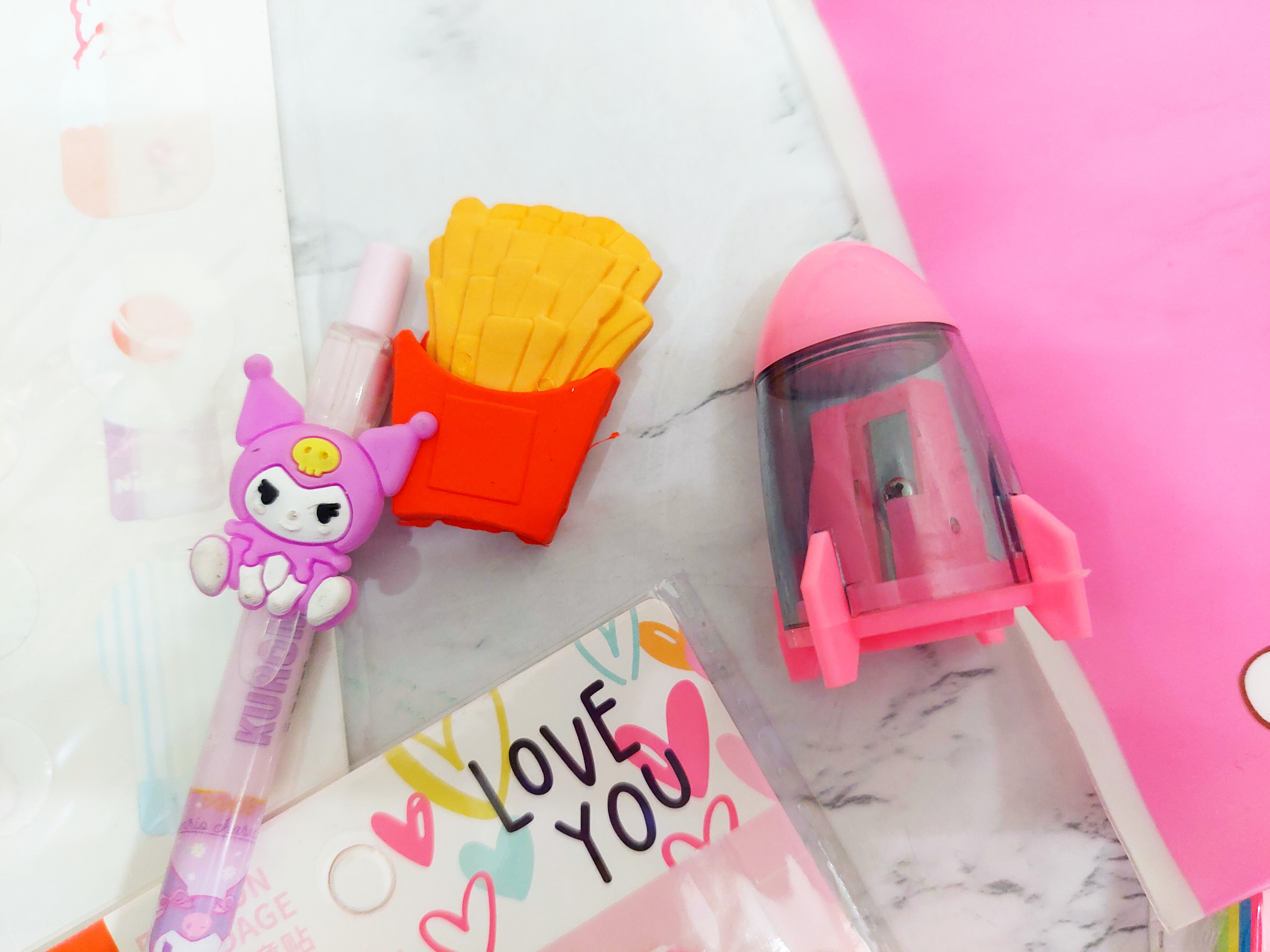 این پک شامل: یک عدد پوشه سایز آپنج، یک عدد چسب زخم فانتزی ، یک عدد برچسب اسم فانتزی ، یک عدد تراش طرح موشک ، یک عدد اتود طرح کرومی ، یک عدد پاکن طرح سیب زمینی سرخ کرده ، یک عدد استیک نوت چهار رنگ
